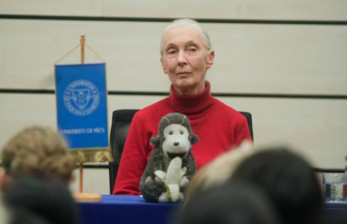 Dr. Jane Goodall 2005. március 10-e óta a PTE díszdoktora. 2010-ben az egyetem meghívására érkezett Pécsre. Előadásában a “De csak egy bolygónk van” gondolatot hangsúlyozta, a bolygó jövőjéért és az állatvédelemért való közös felelősségünkre hívta fel a figyelmet. 2021-ben személyes videóban köszöntötte a PTE végzős hallgatóit.
